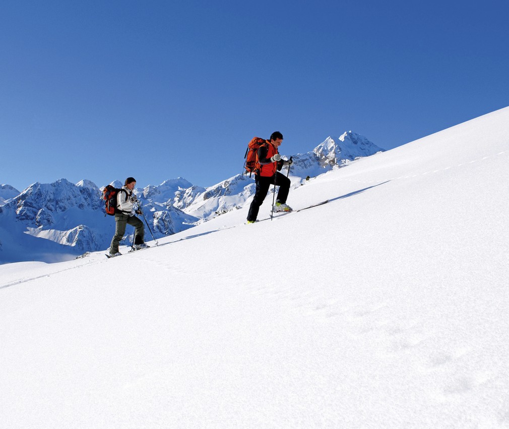Wir wedeln den Südwest-Hang in Richtung Schatzerhütte hinunter, dann gehen wir weiter zur Halslhütte und zurück zum Ausgangspunkt.
